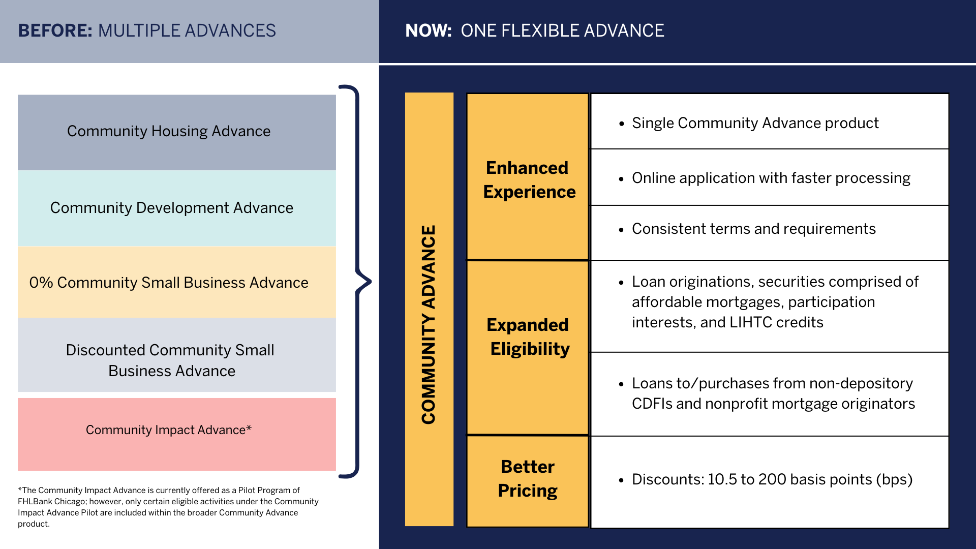 Responding to member feedback, FHLBank Chicago has combined multiple products into one, our new Community Advance, for flexible ease of use, improved application approval experience, and enhanced community building benefits.