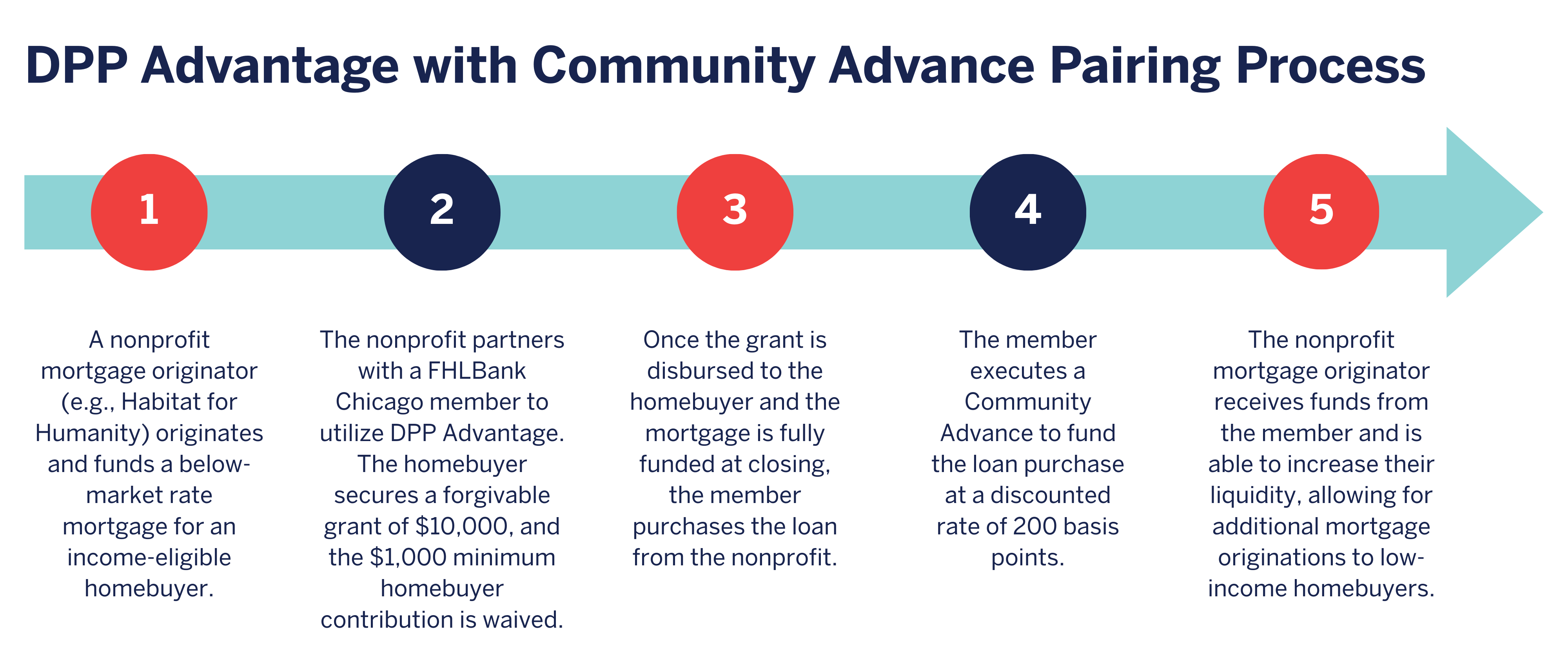 In this example, Habitat for Humanity (Habitat) is the nonprofit mortgage originator. Habitat works with an FHLBank Chicago member to find loans that qualify for the DPP Advantage program. After Habitat originates and funds the loan, it sells the loan to the member, which uses a Community Advance to fund it. This structure allows Habitat to offer 0% or below-market interest mortgages to income-qualified homebuyers while using the member’s discounted funding to improve liquidity and expand its mission-driven impact.