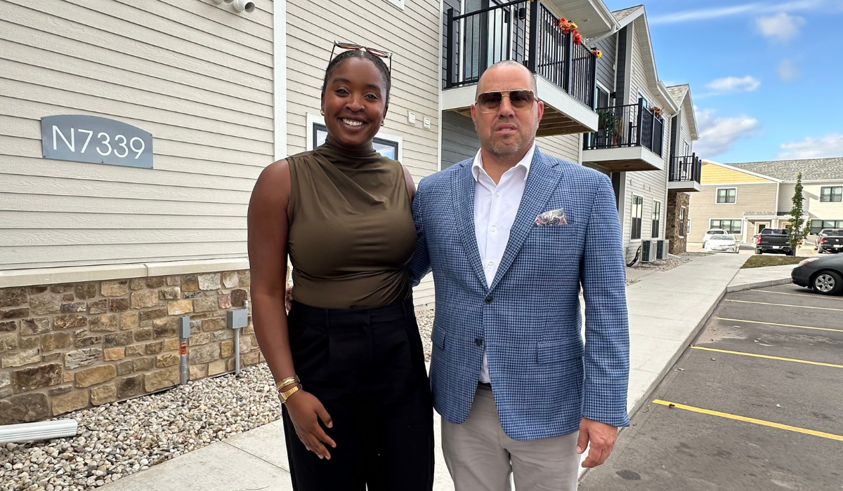 Jess Grant-Domond, Senior Community Outreach and Engagement Specialist at FHLBank Chicago, and project developer Pete King, CEO of King Solutions and a member of 1822 Land & Development Company, at the grand opening of Red Willow Flats in Oneida Nation, Wisconsin, a development supported by $700,000 in Affordable Housing Program (AHP) funding from FHLBank Chicago through member Bay Bank.