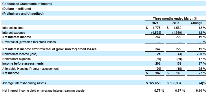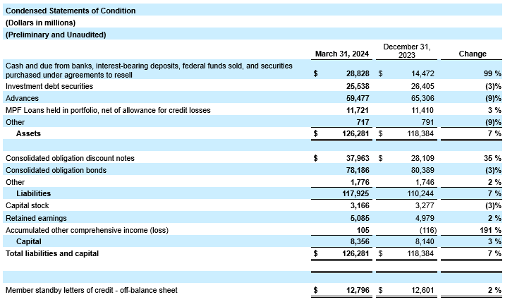 For more financial details, please refer to the Condensed Statements of Income and Statements of Condition below. The Form 10-Q for the quarter ending March 31, 2024, is expected to be filed with the Securities and Exchange Commission (SEC) next month.
